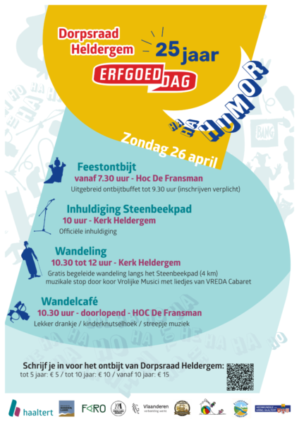 Op zondag 26 april staat Heldergem helemaal in het teken van Erfgoeddag, die dit jaar het thema ‘Ha Ha Humor’ meekrijgt. Het wordt een extra bijzondere editie, want ook de Dorpsraad Heldergem viert haar 25-jarig bestaan. Bezoekers mogen zich verwachten aan een gevarieerd programma vol erfgoed, natuur, muziek en vooral veel gezelligheid.