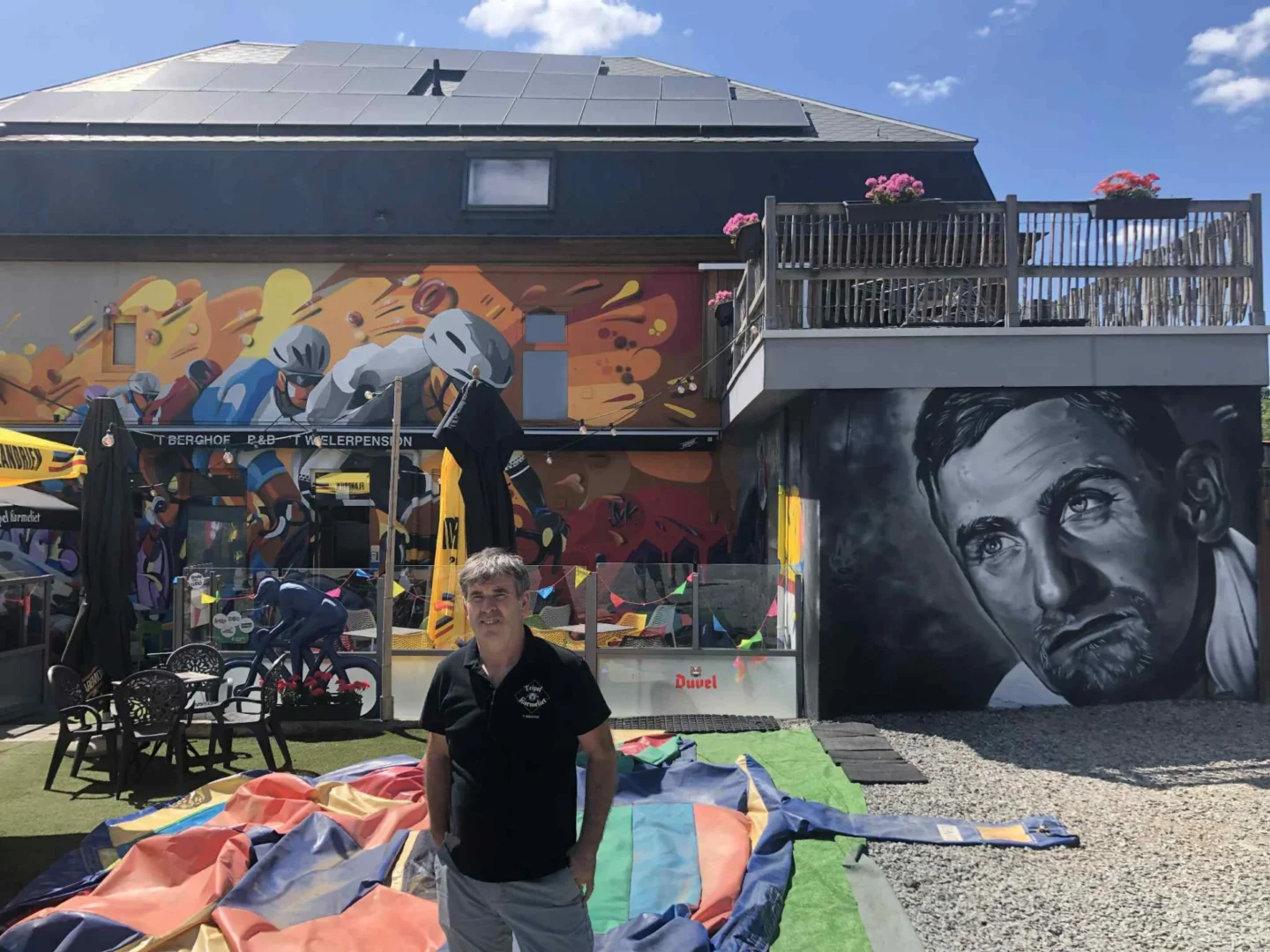 De buitenmuur van Café ‘t Berghof is vandaag niet langer gewoon grijs pleisterwerk. Wat vroeger een anonieme gevel was, is nu een levendig canvas geworden, een tastbare herinnering aan een man die voor velen een sportheld was, maar voor Claudie en de dorpsgemeenschap nog veel meer.