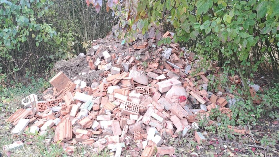 Het afval bestaat uit bouw- en sloopmateriaal, wat niet alleen visueel storend is maar ook potentieel schadelijke stoffen kan bevatten die de bodem en het water vervuilen.