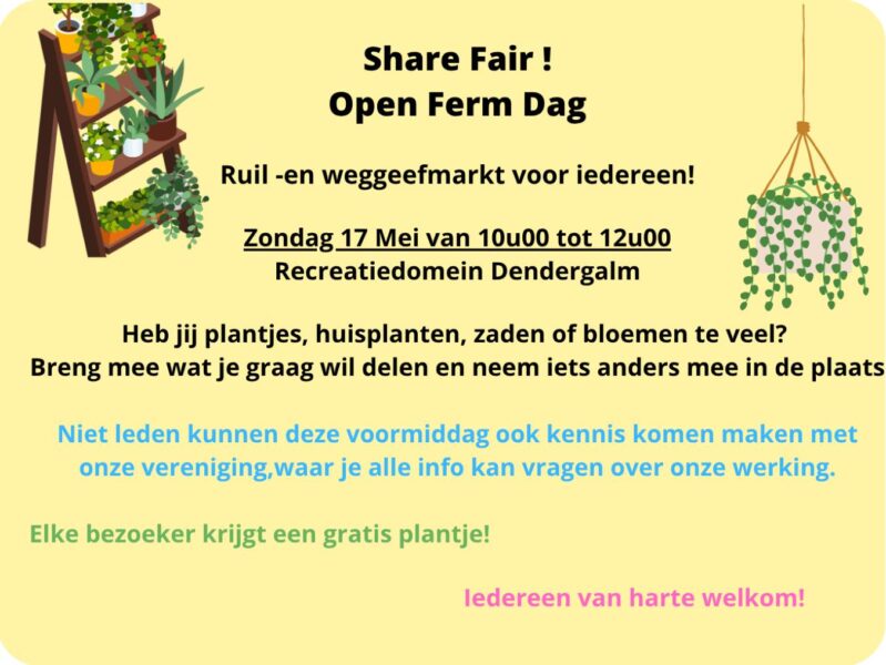 Op zondag 17 mei wordt het recreatiedomein Dendergalm omgetoverd tot een gezellige ontmoetingsplek voor iedereen met een hart voor groen en duurzaamheid. Tijdens de Share Fair Open Ferm Dag staat van 10u00 tot 12u00 alles in het teken van delen, ruilen en elkaar ontmoeten in een ontspannen sfeer.