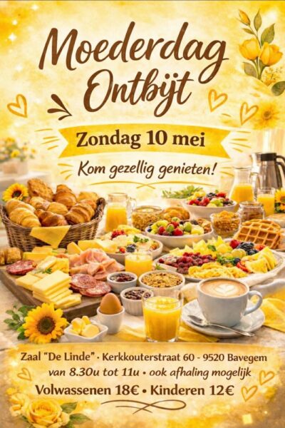 Het Moederdagontbijt vindt plaats in Zaal De Linde (Kerkouterstraat 60, 9520 Bavegem) en loopt van 08.30 uur tot 11.00 uur.